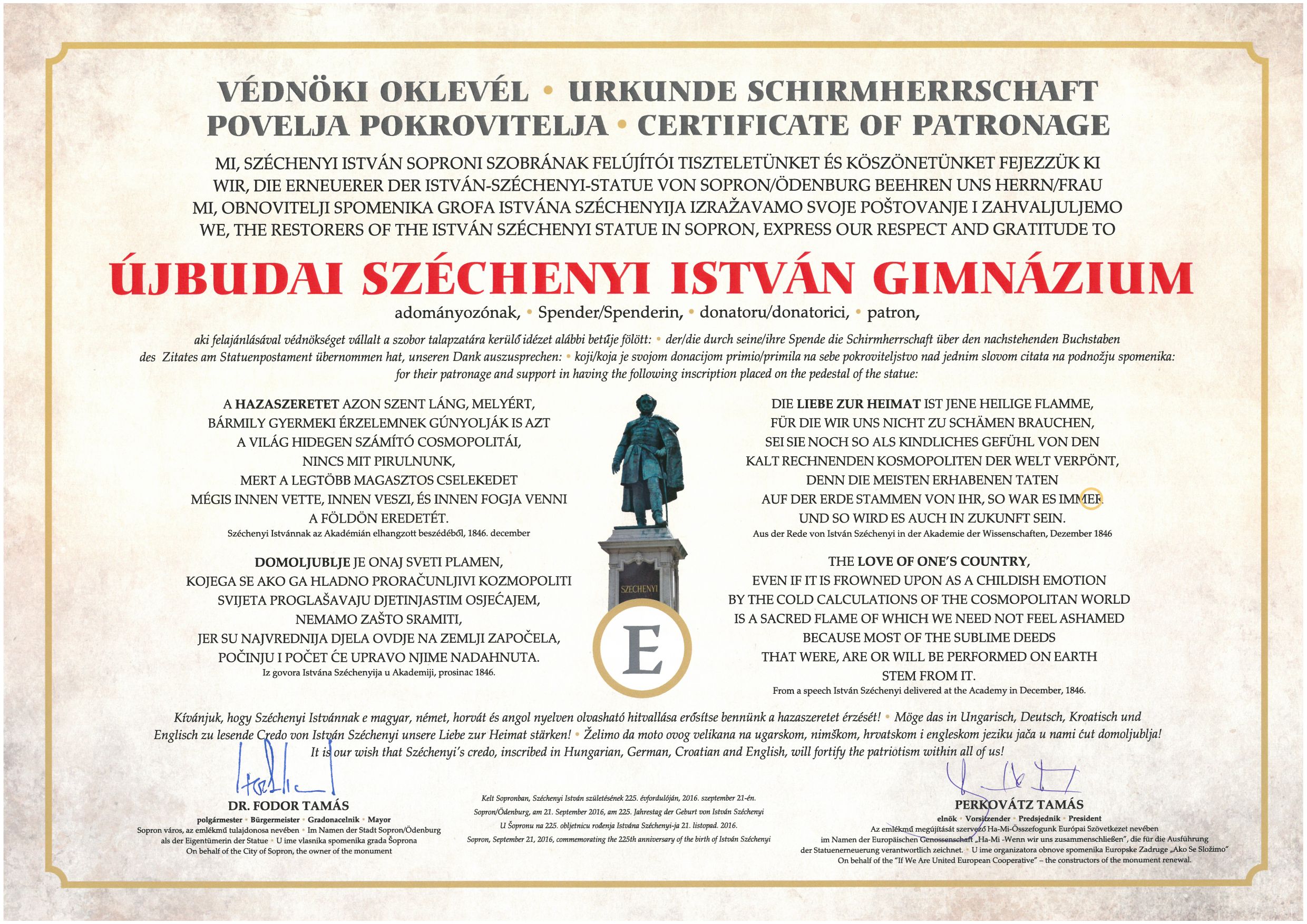 Névadónk, Gróf Széchenyi István születésének 225. évfordulója alkalmából a Ha-Mi-Összefogunk Szövetkezet felhívást tett közzé, hogy a Sopronban található Széchenyi-szobor oldalaira közös összefogásból valósuljon meg, hogy Széchenyi hazaszeretetről vallott gondolatát 4 nyelven véssék fel. Ehhez az elgondoláshoz a mi iskolánk is csatlakozott és egy betűt a négy nyelven íródott szövegből, védnökségünk alá helyeztünk.